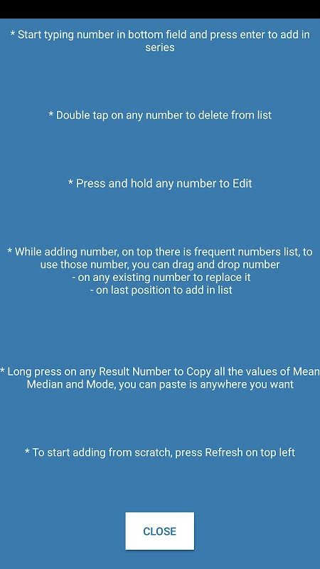 This app calculates and shows you the mean, median and mode of numbers that you enter.