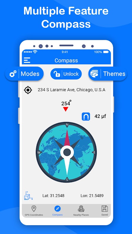 This application not only contains the GPS latitude and longitude but also contains the compass to get the right directions. You can use different compass themes and designs to use for direction finding. Use different map modes to find the right place with coordinates. Find coordinates on the map to search for any address and all nearby places by using the free Measure Coordinates app.