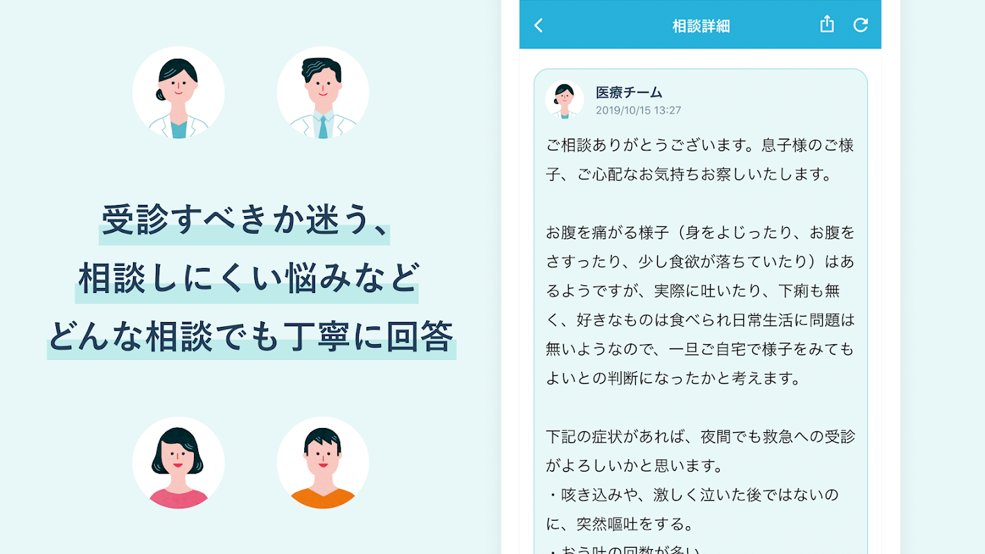 Ngoài "Từ điển bệnh / triệu chứng" cho phép bạn tìm kiếm 1.900 bệnh và "Tư vấn y tế" cho phép bạn trực tiếp tư vấn và nhận câu trả lời cho các vấn đề y tế với đội ngũ y tế tập trung vào các bác sĩ chuyên khoa trong từng khoa, tùy thuộc vào khu vực và khoa lâm sàng. Chúng tôi cung cấp các dịch vụ như "tìm kiếm bệnh viện" cho phép bạn tìm kiếm và "chức năng hướng dẫn" mà bạn có thể sử dụng làm tài liệu tham khảo khi bị ốm hoặc bị thương. Bạn không chỉ có thể tìm kiếm theo tên bệnh như "bệnh cúm" mà còn có thể tìm kiếm thông tin theo các triệu chứng của bệnh, đồng thời có thể hiểu sâu hơn về căn bệnh này và các phương pháp điều trị trong mùa các bệnh truyền nhiễm phổ biến.