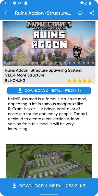 Ứng dụng Structures Mods này bổ sung rất nhiều cấu trúc mà bạn muốn xây dựng ngay lập tức bằng cách sử dụng các khối cấu trúc và rất nhiều cấu trúc được tạo tự nhiên có thể được tìm thấy trong các quần xã sinh vật cụ thể trên thế giới của bạn.