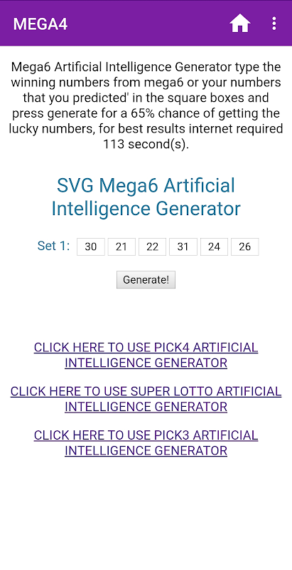 Mega4 is a Artificial intelligence app that pick numbers chose numbers for you base on the winning numbers that you input in the square boxes or you can just press generate.