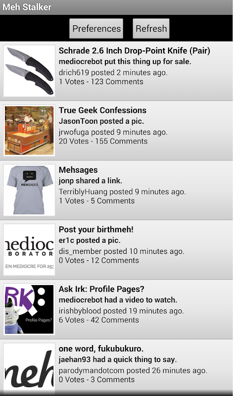 Meh Stalker is a tracker for the daily deal site Meh.com. It allows you to see the current details of the item for sale, as well as search for historical information. You can also set up custom notifications, set a reminder, create a home page widget, register for alerts, and even watch the daily videos and read what's going on in the forum.