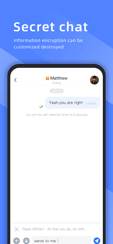 对于那些对特别注重隐私的人,Melon提供秘密聊天。秘密聊天信息可以被自动自毁。通过这种方式,你可以发送所有类型的消失的内容-消息,照片,视频,甚至文件。秘密聊天使用端到端加密来确保消息只能由其指定的收件人读取。