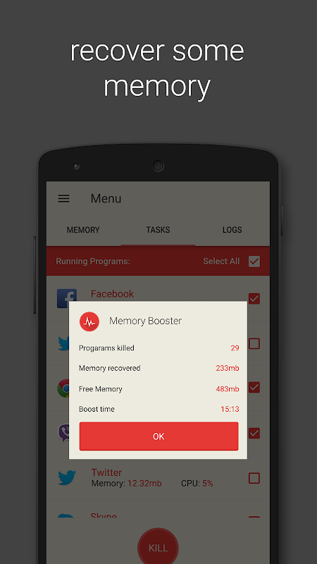 - Tự động tăng cho phép Memory Booster để chạy trong nền và tự động đòi bộ nhớ cho Android của bạn ở khoảng.