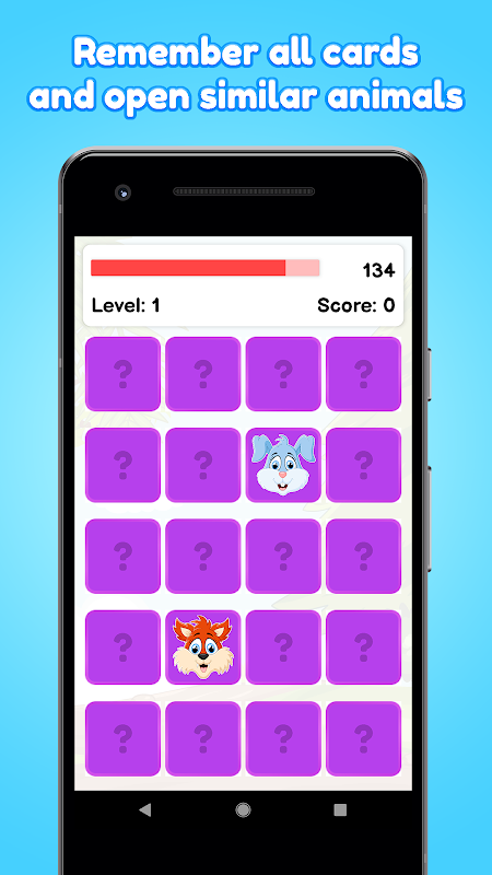 The game is for training of ability to memorize and to concentrate with funny animals. Remember all cards and open similar animals.