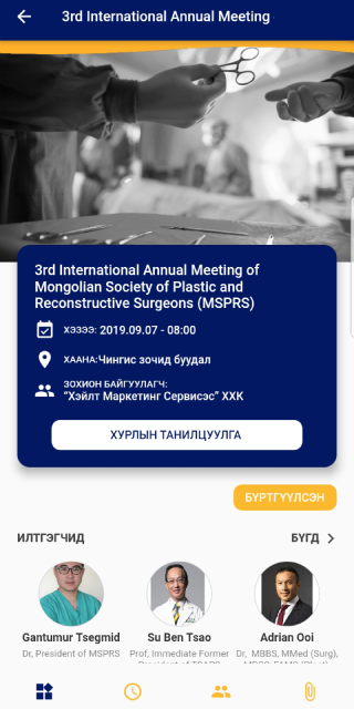 Ứng dụng Mendmn là một công cụ toàn diện để liệt kê tất cả các hội nghị chuyên đề y tế, hội nghị và hội thảo cho các chuyên gia chăm sóc sức khỏe tại Mông Cổ.