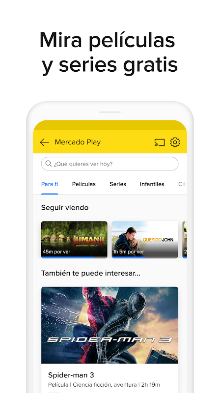 Disfruta gratis de películas, series y contenido infantil en Mercado Play. Puedes hacerlo desde tu computadora o celular. También puedes transmitir en tu televisor a través de chromecast. Accede desde el ícono en la página principal de Mercado Libre para ver películas y series cuando quieras.