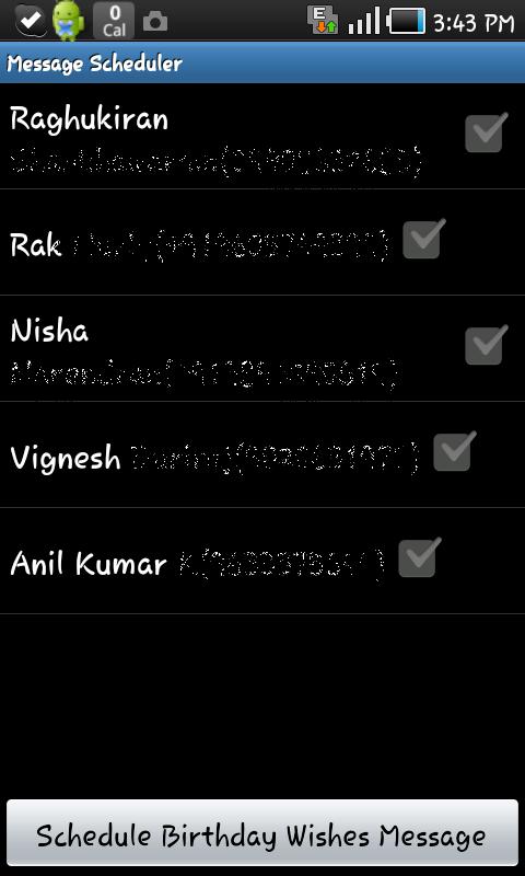 3.) A button to schedule Birthday messages : This will list out all the contacts that have valid birthday information set in the contacts (phonebook).