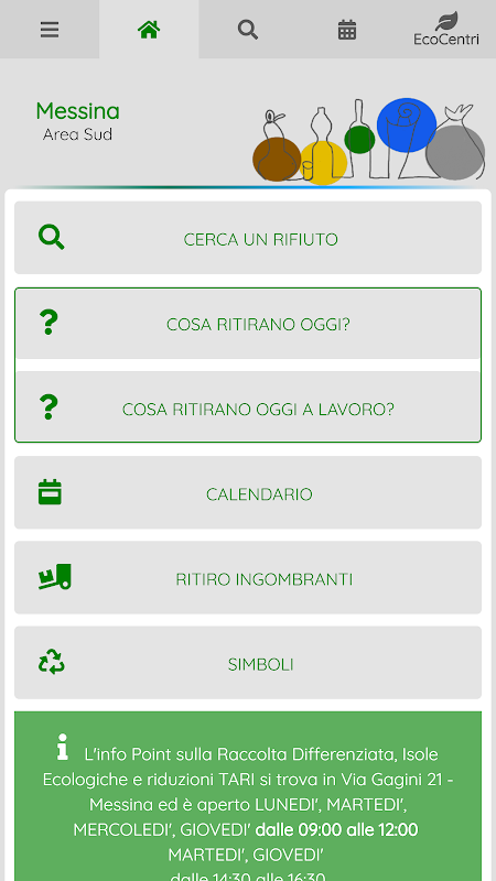 Mục đích của nó là hỗ trợ công dân trong việc quản lý hàng ngày cả chất thải sinh hoạt và phi sinh vật. Có thể chọn 2 khu vực thuộc về gia đình và cơ quan, để biết chỉ với một cú chạm đơn giản những gì cần cung cấp hàng ngày, nghiên cứu đối tượng của bạn và biết cách loại bỏ nó và hơn thế nữa!