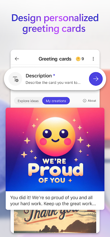 Giải phóng khả năng sáng tạo của bạn—tạo, thiết kế và chỉnh sửa trực quan mọi thứ bạn có thể tưởng tượng bằng AI. Sử dụng sức mạnh của AI tổng hợp để tạo ra những hình ảnh bắt mắt bằng từ ngữ của bạn, tạo ra các thiết kế cấp độ tiếp theo nổi bật như thiệp sinh nhật, thiệp ngày lễ và hình nền được cá nhân hóa cho điện thoại của bạn và thậm chí sử dụng AI để chỉnh sửa ảnh như một chuyên gia, chẳng hạn như xóa nền ảnh của bạn. Tạo những gì bạn muốn, khi nào và ở đâu bạn cần.