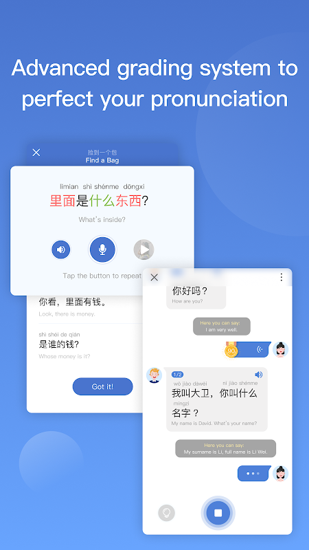 Artificial Intelligence Scoring. Advance grading system to perfect your pronunciation and practice conversation with our chatbots.
