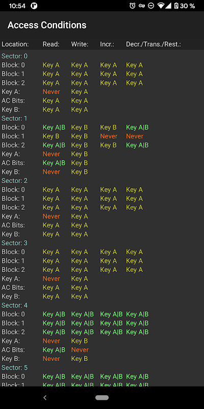 • Hiển thị Điều kiện truy cập cổ điển MIFARE dưới dạng bảng