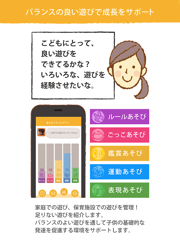 心理学者のビューラーやピアジェが提唱する遊びの概念をもとに「バラエティに富んだ遊びを、バランス良く遊び尽くして欲しい!」との考えから生まれました。