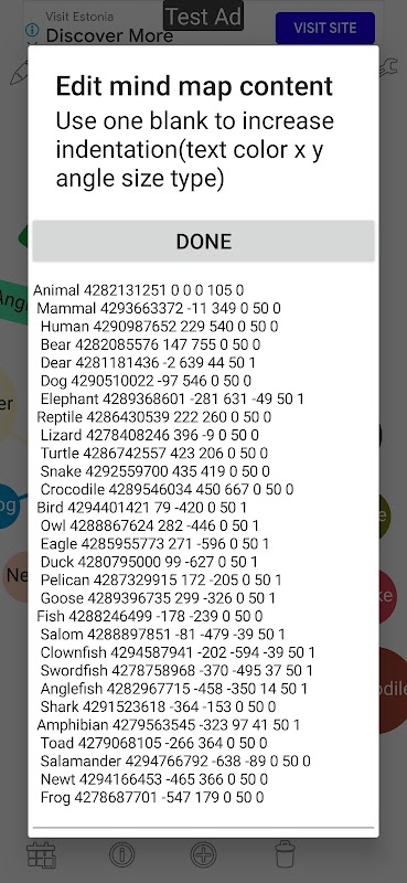 Edit: Edit the mind map content(use a blank space to increase the indentation: Color coordinateX coordinateY angle size type)