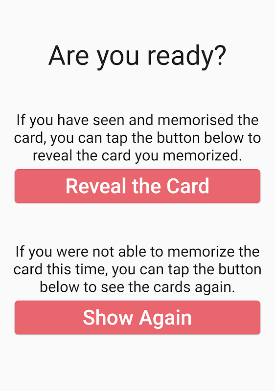Một loạt các thẻ chơi từ boong sẽ được hiển thị cho bạn. Bạn phải chọn một thẻ trong tâm trí của bạn như boong được nhanh chóng riffled qua. Trong một thời điểm, ứng dụng này sẽ tiết lộ các thẻ nhớ của bạn giống như ảo thuật!