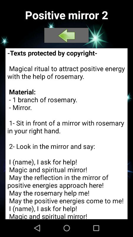 Ứng dụng này bao gồm các phép thuật năng lượng tích cực cho bản thân vì vậy điều quan trọng là sử dụng gương. Để có thể phản ánh hình ảnh của chúng tôi để có kết nối tâm linh nhiều hơn với linh hồn và hào quang của chúng tôi.