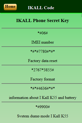 You can find the secret code of your I KALL Android mobile devices. In this app, there are various hidden codes given which can be working on the Android devices. I KALL mobile secret codes can also be used for obtain access to the secret portal of the Android services. After execute the secret code, your device might be affected. So keep backup your all data before execute any secret code. We will not be responsible for any damage of your mobile device. It is not official app of I KALL.