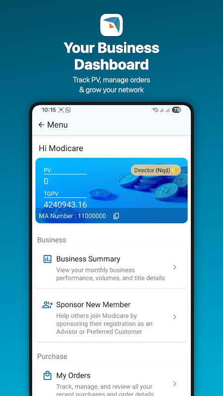 Quản lý doanh nghiệp của bạn khi đang di chuyển với Ứng dụng di động Modicare! Ứng dụng này là văn phòng ảo của bạn đi kèm với bảng điều khiển được cá nhân hóa cho phép bạn quản lý và phát triển doanh nghiệp của mình. Bạn có thể theo dõi khối lượng và mục tiêu kinh doanh của mình và nhóm của bạn, tài trợ cho tuyến dưới mới, có được khách hàng mới và luôn cập nhật về các sự kiện và đào tạo.
