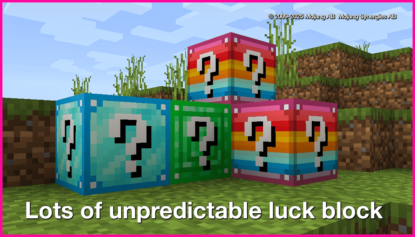Khối may mắn addon đầu tiên cho minecraft. Đó là mod khối may mắn cho minecraft pe 1.21 có thể mang lại sự ngẫu nhiên cho trò chơi. Khối may mắn cho mcpe 1.20 là gì? Đây là những mod khối may mắn màu vàng có dấu chấm hỏi. Đôi khi các khối may mắn cho minecraft được tìm thấy trong quần xã, nhưng điều này hầu như không bao giờ xảy ra. Ngay khi người chơi phá vỡ khối may mắn mcpe 1.20, một số hành động ngẫu nhiên sẽ xảy ra. Đây có thể là một hành động tốt và cũng có thể là một hành động xấu. Tất cả phụ thuộc vào may mắn. Phá khối may mắn minecraft 1.21 rất thú vị và khó đoán. Bạn có thể nhận được những vật phẩm hữu ích từ nó - đá đỏ hoặc một bộ mod áo giáp. Nhưng nếu không may mắn, bạn có thể nhận được một cây leo hoặc thứ gì đó thậm chí còn tệ hơn từ mod khối may mắn. Vì vậy, bạn không nên mở khối may mắn cho mcpe gần nhà. Rốt cuộc, bạn không bao giờ có thể đoán được điều bất ngờ nào sẽ chờ đợi bạn từ những khối may mắn tiếp theo của minecraft!