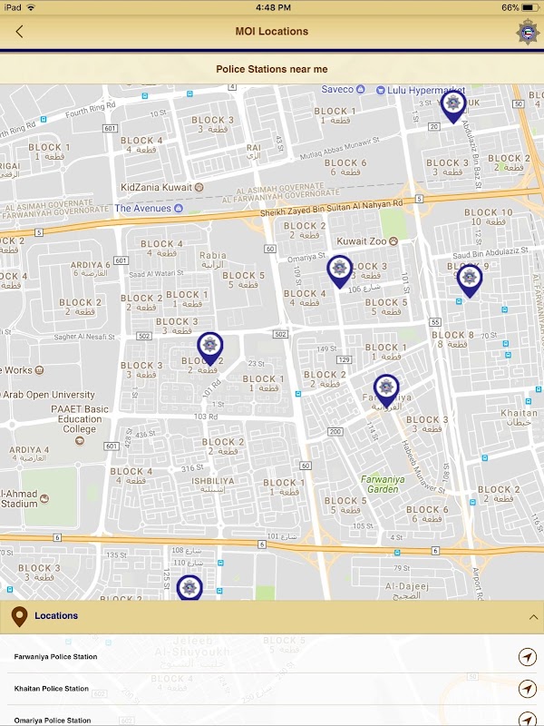 This service helps to identify the location of the Ministry of Interior Departments, Police Stations and Service Centers and their working hours. In addition this service will help to determine the nearest route to reach to those locations.