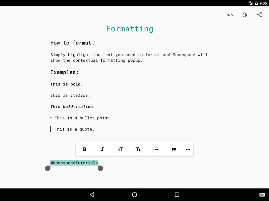 Monospace Writer supports Bold, Italics, Strikethrough, Bullet, Quote and a bunch of size related formatting styles.