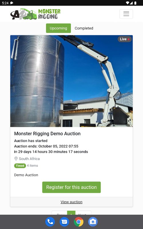 If you need to join and bid online at a Monster Rigging auction, simply download the app to register and take part in the online bidding. Register for an account. Once approved you can bid online. Watch an auction in real-time and access our auction from anywhere.