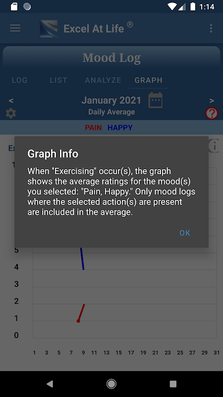 Để làm cho Nhật ký tâm trạng hiệu quả hơn nữa, tính năng biểu đồ cho phép bạn xem các tâm trạng và hành động khác nhau cùng nhau. Điều này cho phép bạn phân tích các mẫu dựa trên nhiều hành động. Ví dụ, bạn có thể thấy tâm trạng của mình thay đổi như thế nào khi bạn làm việc gì đó một mình hoặc với ai đó.