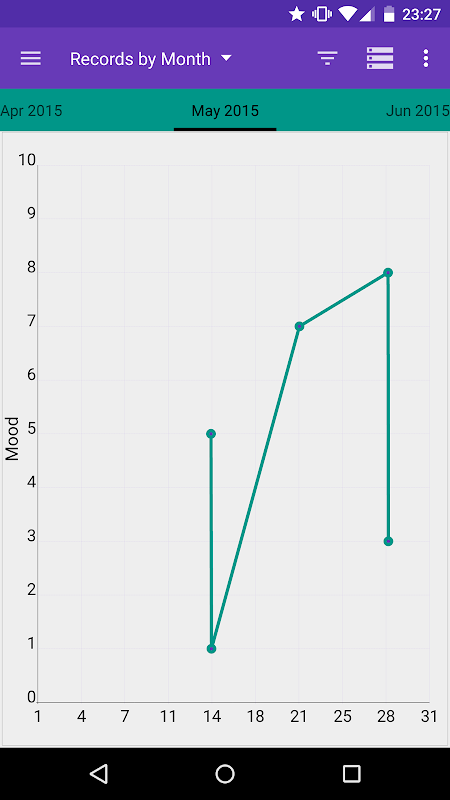 • Xem sự kiện của bạn trên một đồ thị theo năm, tháng tuần hoặc tất cả tâm trạng cùng một lúc. Xem đồ thị có thể hữu ích trong việc tìm kiếm các mẫu trong tâm trạng