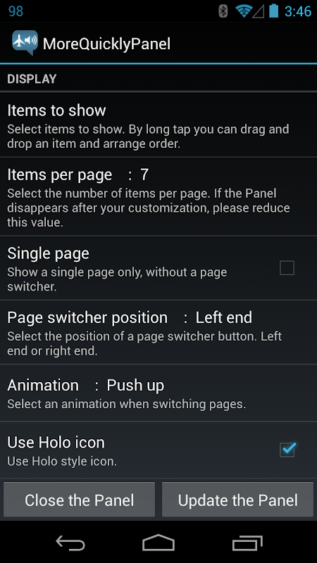 - The notification panel always closes after touch. Please use the option 'Re-expand the panel'. (2.3 only)