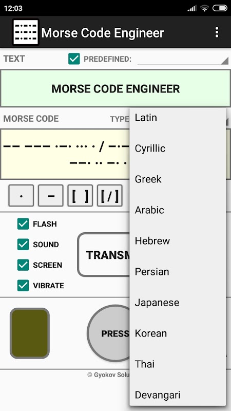 Bộ giải mã âm thanh và ánh sáng mã Morse, máy phát và mã morse <-> trình dịch văn bản. Giải mã âm thanh hoặc ánh sáng truyền mã morse. Truyền bằng âm thanh, đèn flash, màn hình và rung