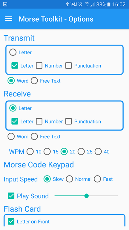 Có một vài tùy chọn cho phép bạn chọn tập quán khác nhau để truyền và nhận được mã morse, làm thế nào bạn muốn thẻ flash được hiển thị, mã morse tỷ lệ mẫu giải mã, vv