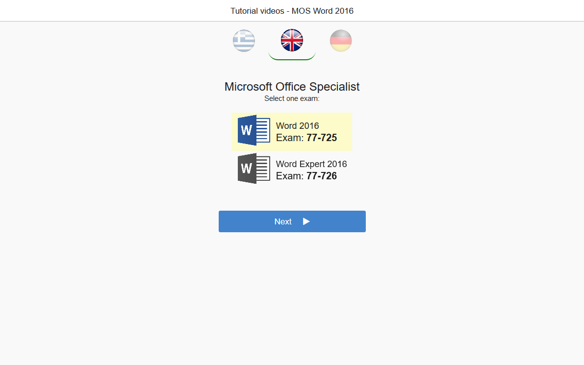 This app provides the users with the opportunity to get an initial picture about the MOS Certiport 77-725 & 77-726 Exams, which lead to the respective Certificate acquisition for MS-Word 2016.