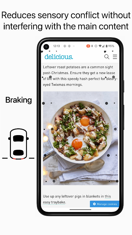 Motion Cues hoạt động liền mạch với các cảm biến trên thiết bị của bạn để mang đến trải nghiệm không buồn nôn ở bất cứ nơi đâu bạn đến.
