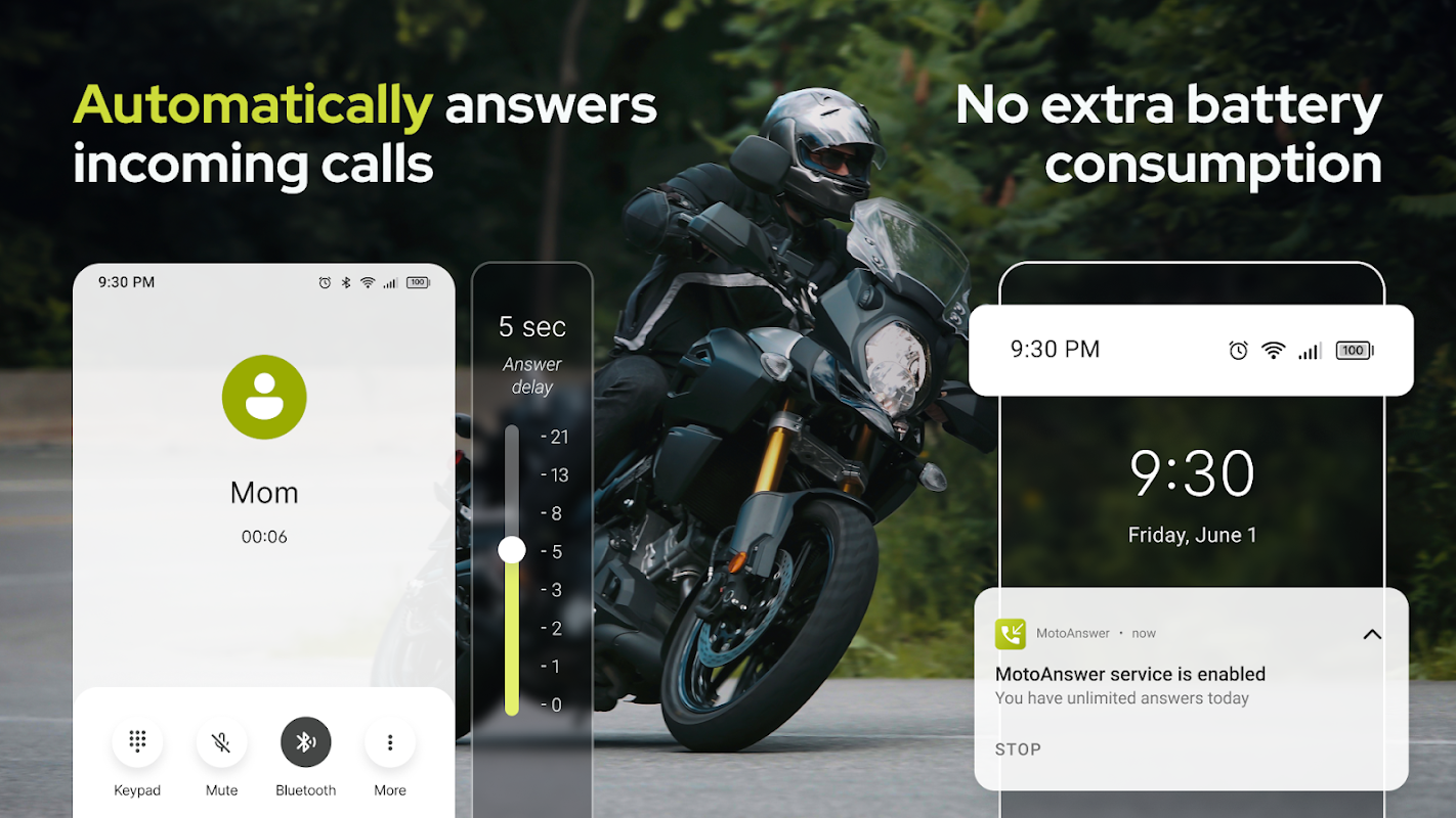 Ứng dụng MotoAnswer cải tiến được thiết kế để hoạt động như một trả lời cuộc gọi tự động khi bạn đang lái xe, chạy bộ hoặc đạp xe, đảm bảo bạn luôn kết nối mà không cần rời tay khỏi vô lăng hoặc mắt không nhìn đường.