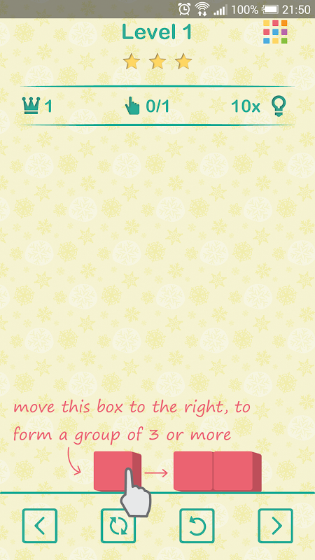 Group 3 or more boxes of the same color together to make them explode. Destroy all the boxes to finish a level. Use as few moves as possible to get a higher score.