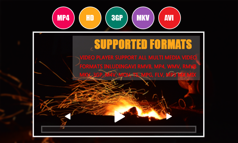 Play all format video, including MKV, MP4, M4V, AVI, MOV, 3GP, FLV, WMV, RMVB, TS etc.