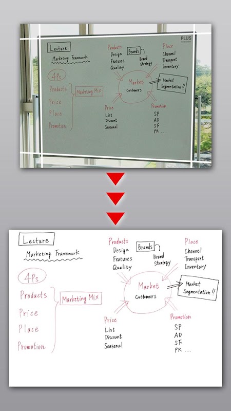 App Điều này làm cho nó dễ dàng để tổ chức các bài viết bảng trắng bằng cách tối ưu hóa hình ảnh chụp bằng cách sử dụng công nghệ độc đáo nhận dạng khung hình cũng như chỉnh sửa đá chính. Các dữ liệu được lưu có thể được tổ chức theo các thư mục, gửi qua e-mail, gửi cho Evernote, Dropbox và có thể được lưu vào Camera Roll.