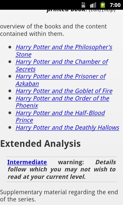 This ebook provides an extensive detailing of all the Harry Potter series books, characters, places, events, and magic. It offers critical commentary and analysis of the books and characters presented to help others better understand detailed situations. This ebook develops a comprehensive index which allows for easy lookup of information for reference readers. It minimizes unnecessary spoilers through a structured set of pages that allow the reader to explore storyline content as deep as he/she wishes to go.