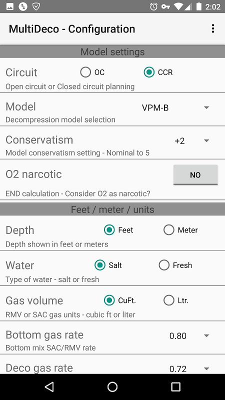 Multideco trình bày mô hình giải nén khác nhau trong một ứng dụng. Chọn từ: VPM-B, VPM-B / E, VPM-B/FBO, ZHL-16B, ZHL-16C, GF, GFS.