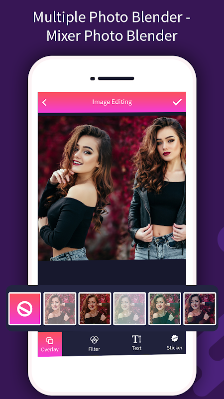 Multiple Photo Blender - Mixer Photo Editor application with converting your image into best blend effects with simple steps. Just select images from mobile gallery and start to decorate it with awesome blend effects. It has also the best collection of amazing effects, filters with your image look more stunning or application also allows users to apply the name with text. Create a more beautiful image with stickers option.