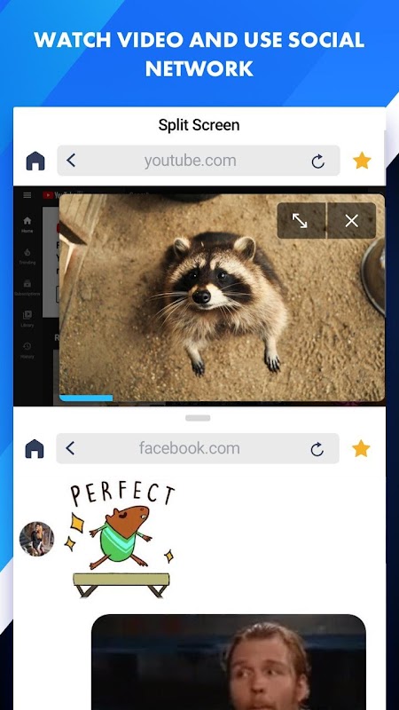 Browse your favorite social network and watch funny videos simultaneosly. Now it's possible with Multitasking Split Screen. Don't switch between tabs, split screen and open them in multi mode on your phone.