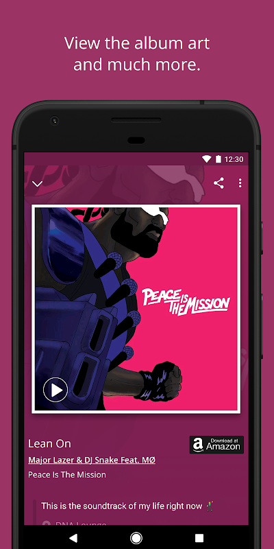 Instantly identify music playing around you - for free. See album art for your favorite artists the way they intended it, in all its glory. Add a note to yourself so you can remember WHY and WHERE you identified that amazing song. Like that tune you heard in the local coffee shop? Wanna know more about that hot new artist? Tap and see more of their music, view similar artists, and more.