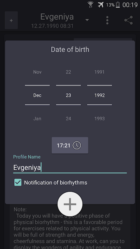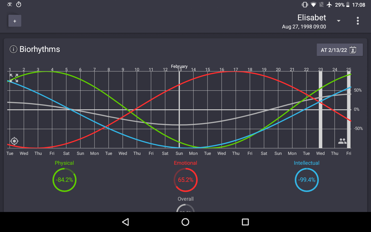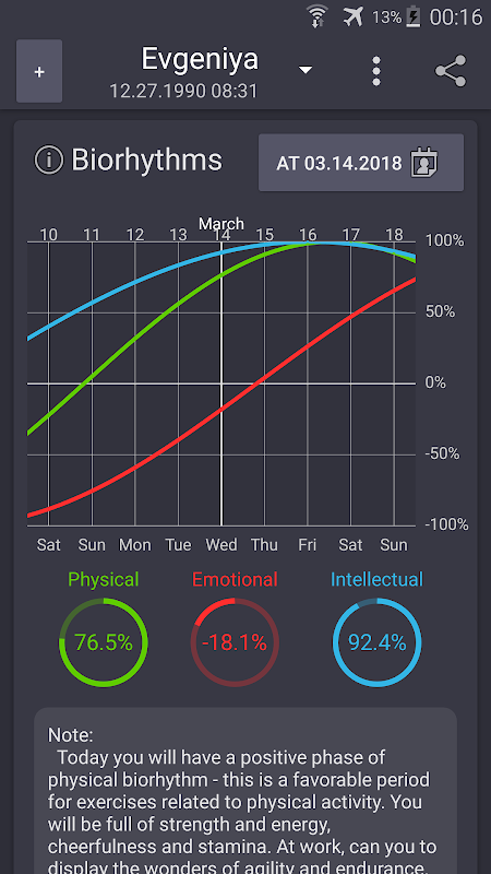 Đây là một ứng dụng tiện lợi và dễ sử dụng cho phép bạn tính toán các dự báo về nhịp sinh học cá nhân cho một ngày đã chọn cho mỗi người dùng. Nó có giao diện thân thiện với người dùng, cho phép bạn tìm thấy những ngày nguy hiểm nhất trong tháng, tính toán nhịp sinh học của bạn cho ngày hôm nay (hoặc bất kỳ ngày nào khác) và xem trên biểu đồ nhịp sinh học của bạn sẽ thay đổi như thế nào trong vòng một tháng. Tính toán được thực hiện với độ chính xác cao. Biết được nhịp sinh học của bạn, bạn luôn có thể chắc chắn những gì mong đợi từ mỗi ngày là rất thuận tiện, nhanh chóng và hoàn toàn miễn phí.