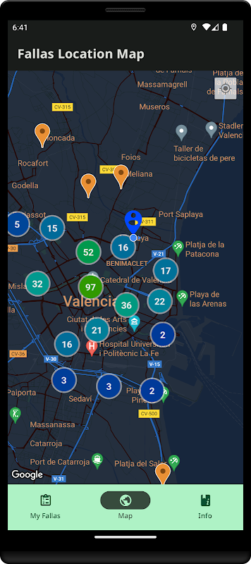 Hướng dẫn về Fallas của tôi hiển thị danh sách tất cả các di tích Fallas được hiển thị trên màn hình chính. Người dùng có thể truy cập chúng và xem chi tiết đầy đủ của chúng, bao gồm cả bản phác thảo của nghệ sĩ về cách Falla sẽ được chế tạo và vị trí địa lý của nó.