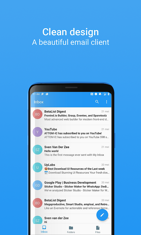 My Inbox is the best Android email client for Gmail. With My Inbox you will never lose track of your emails and attachments by simply organizing them into folders either by file type or your own folders. For the night owls between us we have added the dark mode feature.