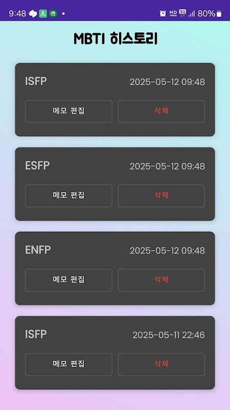 Ứng dụng này giúp bạn ghi lại MBTI của mình, theo dõi những thay đổi theo thời gian và kiểm tra khả năng tương thích với các loại tính cách khác.