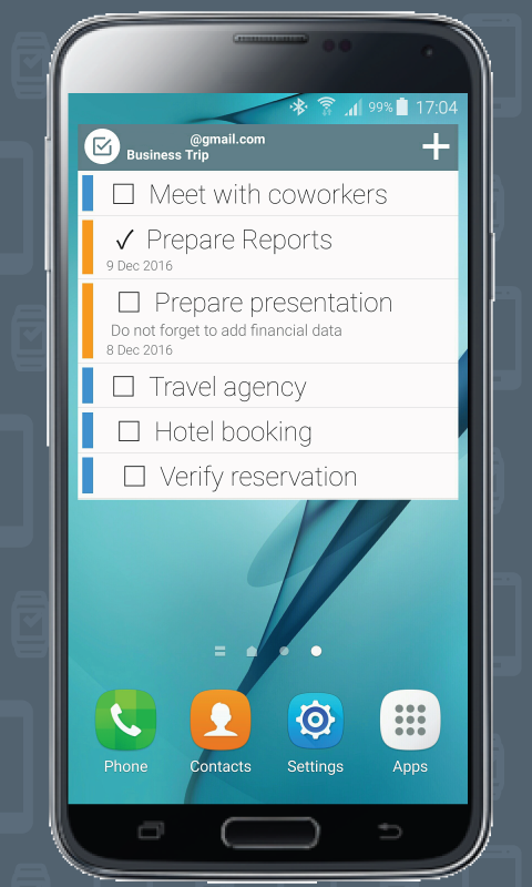 My Tasks syncs your Google Tasks™ across your Android devices. The best part is that you can manage your Google Tasks™ directly from your wrist, using your Samsung Gear smartwatch.