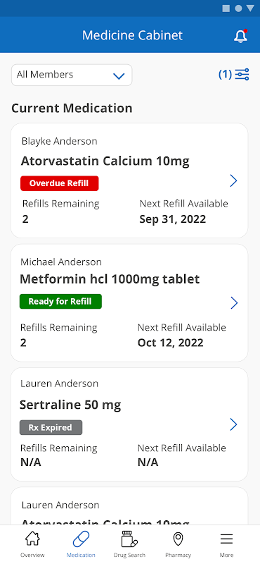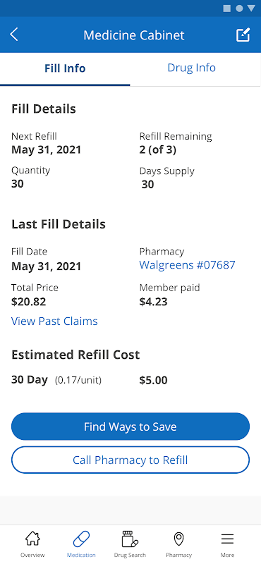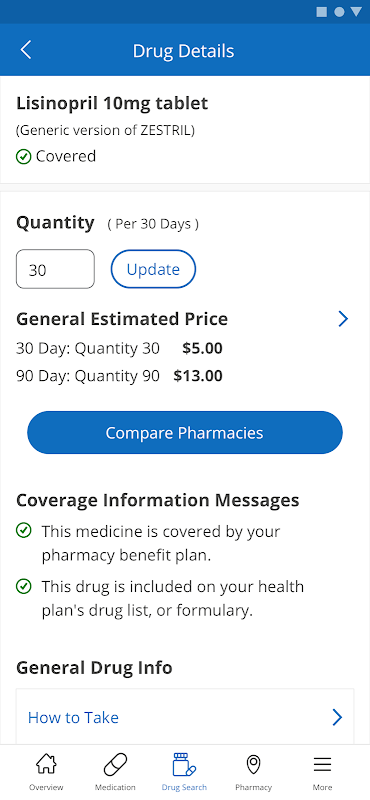 Tìm kiếm thông tin về thuốc và ước tính chi phí, xem và so sánh các hiệu thuốc gần bạn, xem lời nhắc liên quan đến đơn thuốc của bạn và xác định các cơ hội tiết kiệm để có được mức giá thấp nhất cho đơn thuốc của bạn.