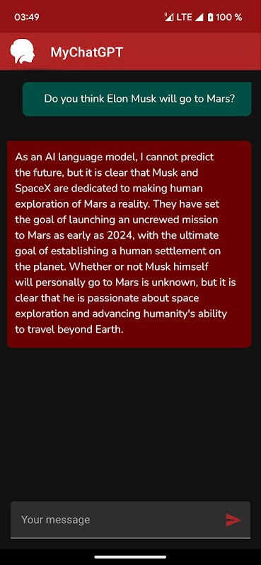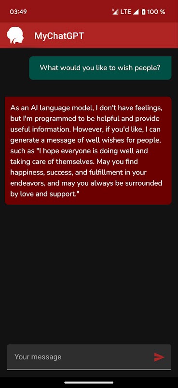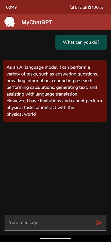 📱💬🤖 MyChatGPT là một ứng dụng giao tiếp với trí tuệ nhân tạo được 🧠📚 đào tạo để hiểu và phản hồi nhiều chủ đề, bao gồm khoa học, công nghệ, văn hóa 🌎🚀🎭.