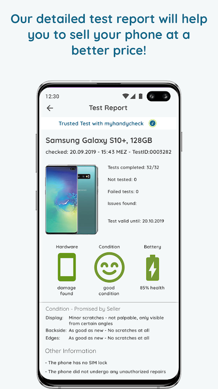 After our test you'll get a very detailed report including results and also technical specifications of your phone. The test is stored on our server and cannot be faked. You can share the link to the report with anyone who might be interested in it - for example someone you want to sell your device to. It's much more trustworthy to privately sell a phone, when you can assure its functionality - and you might be even getting more money for it!